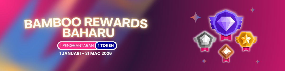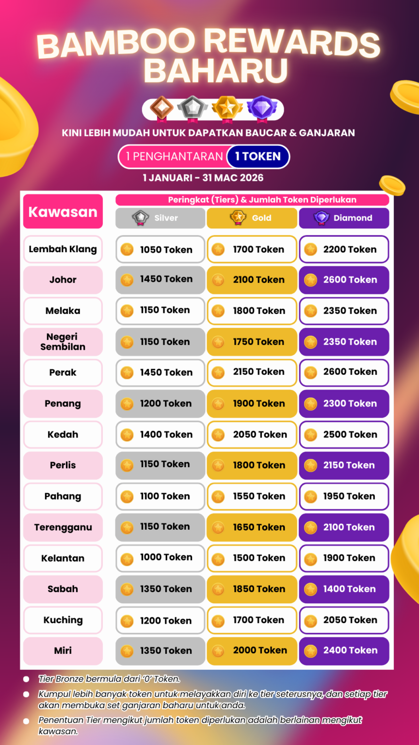 Bamboo Rewards Baharu mempunyai 4 tier, iaitu Bronze, Silver , Gold dan Diamond . Anda boleh rujuk jadual di atas untuk jumlah token diperlukan mengikut kawasan untuk kenaikan peringkat ‘Tier’.