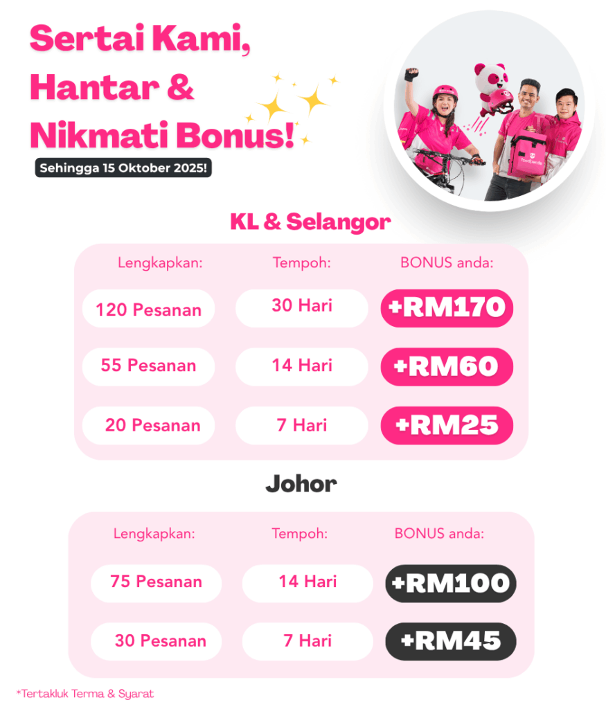 Selamat datang ke foodpanda! Kami sangat teruja dengan penyertaan anda. Oleh sebab itu, kami menyediakan “New Hire Bonus” khas untuk semua kemasukan baru foodpanda (rider dan walker)