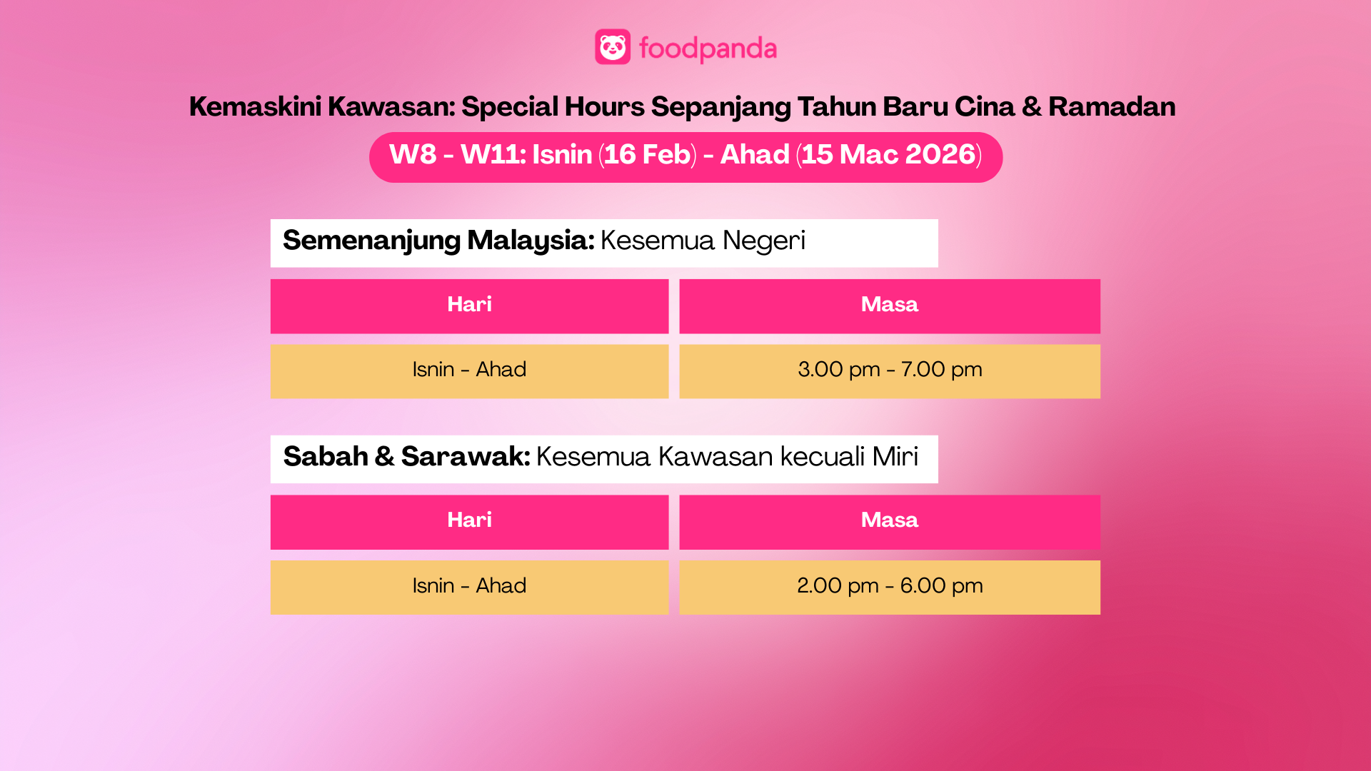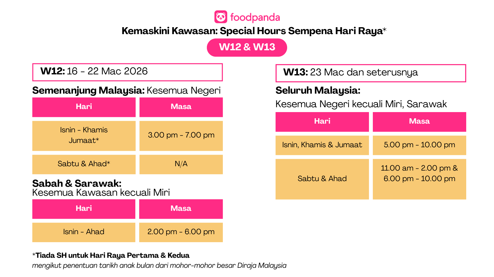 Waktu ini akan ditetapkan oleh foodpanda pada setiap minggu. Pengiraan markah bagi “Special Hours” terhad kepada sesi yang telah anda tempah.