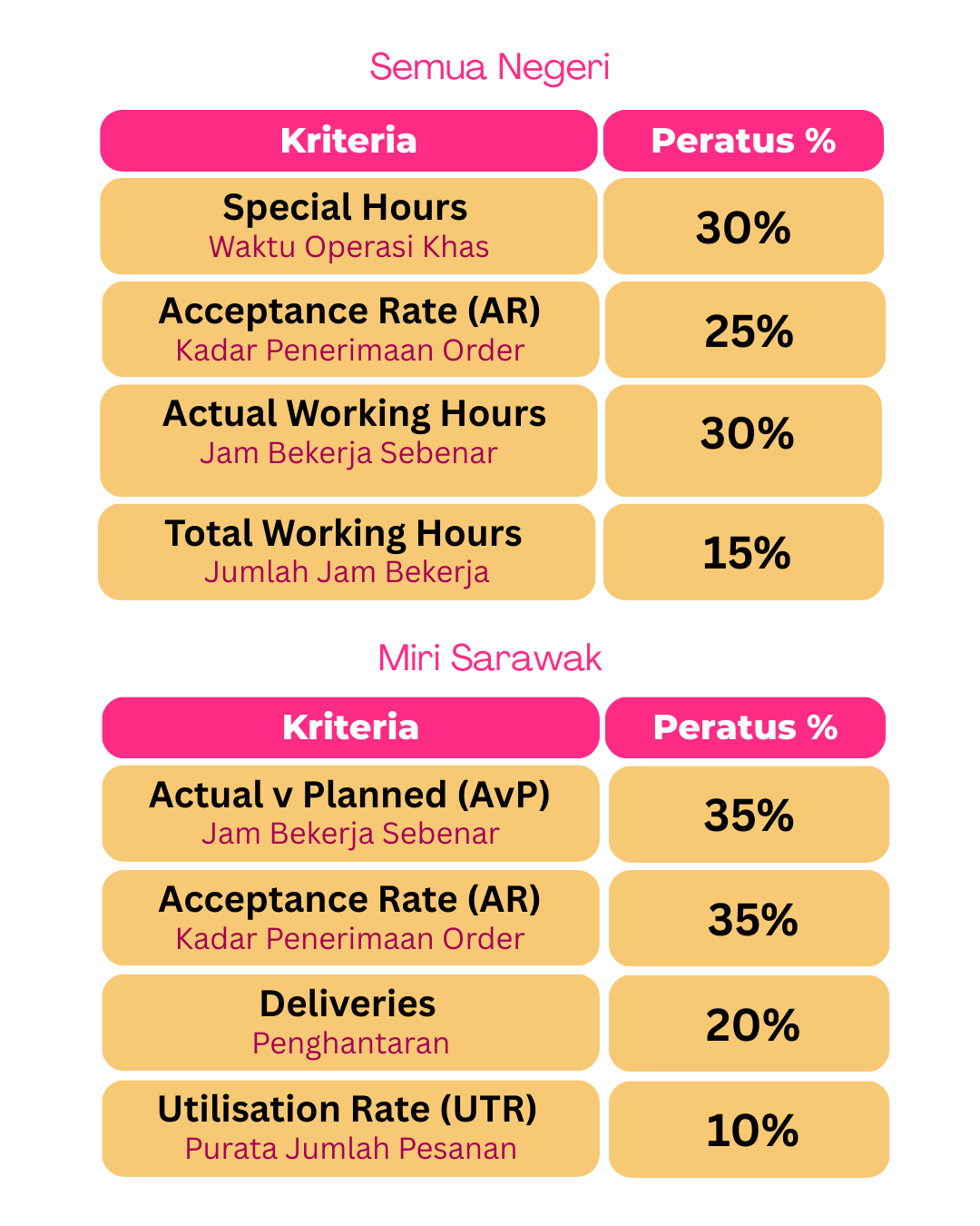 Mekanisme KPI penghantaran terbaru adalah lebih adil dan tepat. Mekanisme KPI ini ditentukan dalam tempoh masa yang sama, untuk memastikan setiap rider akan dibandingkan dengan rider lain yang bekerja dalam tempoh waktu dan negeri yang sama.